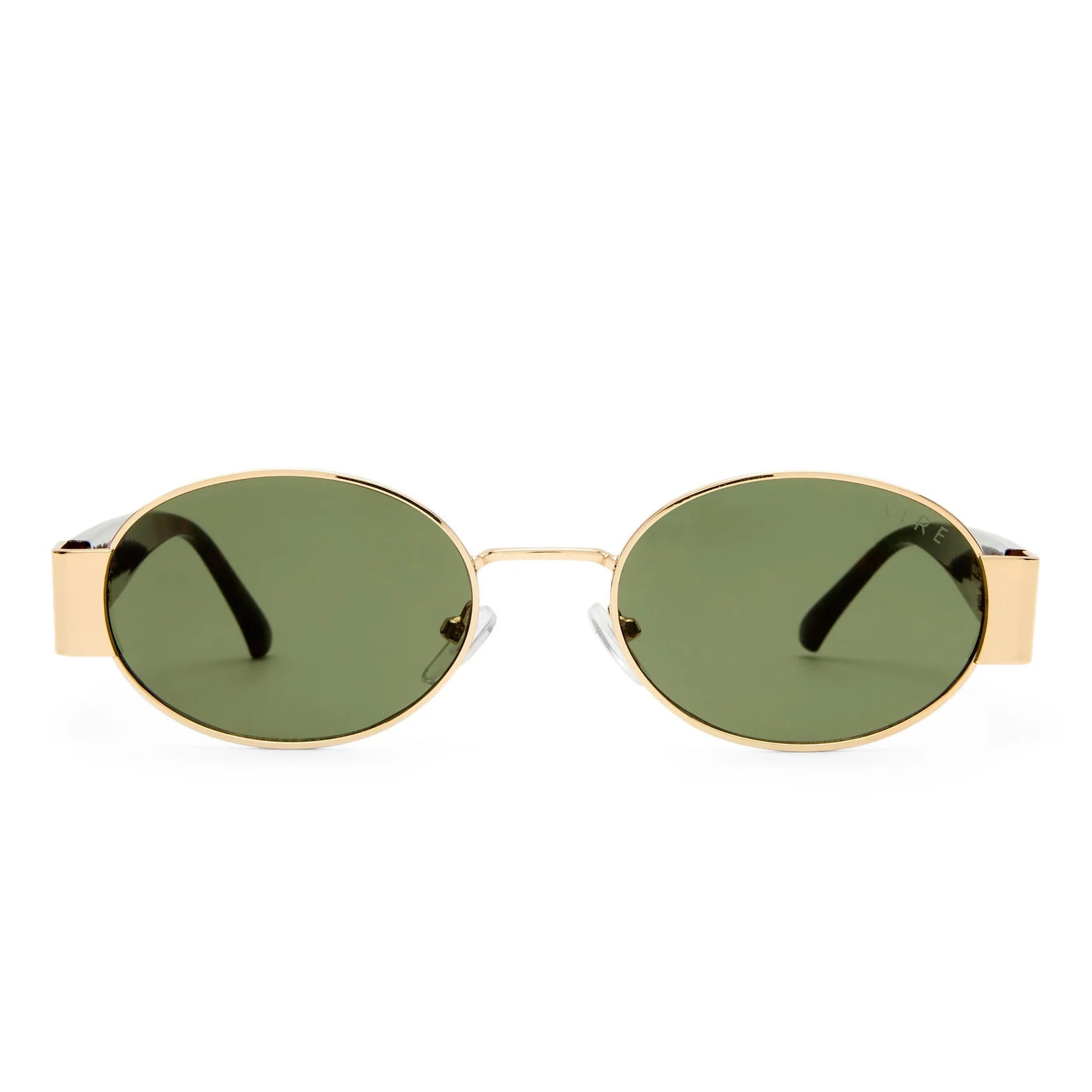 • Finished in a gold and dark tort frame with green mono lenses.