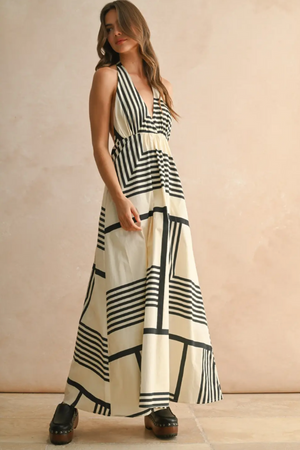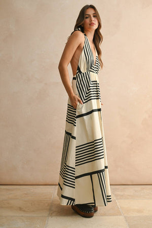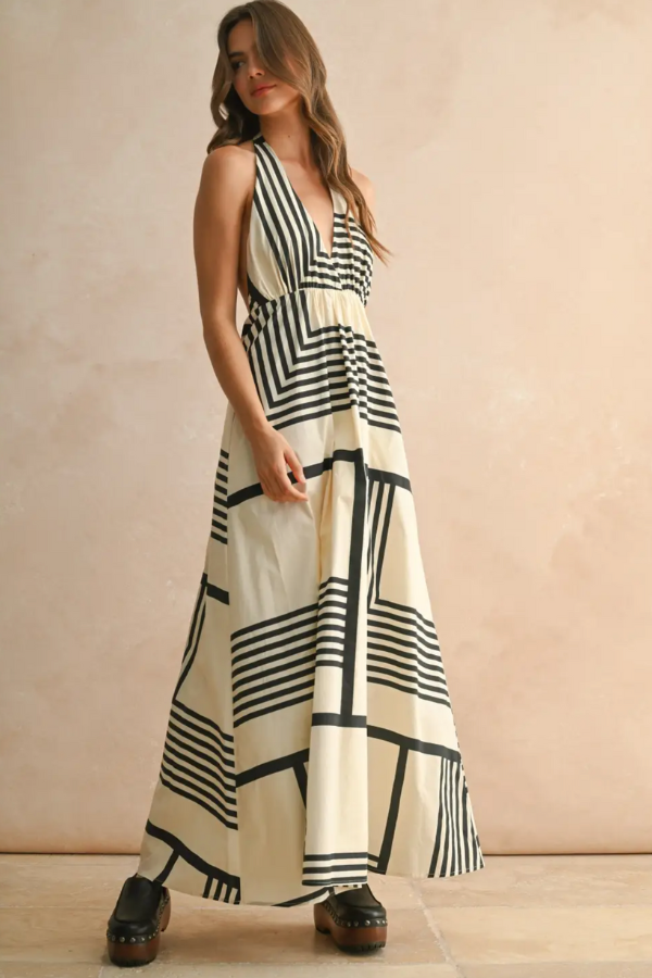 Turn heads in this Geo Print Halter Maxi Dress, featuring playful halter neck ties and a daring low back. Its bold geometric pattern adds a fun, modern twist, while the flowing maxi length keeps you comfortable and stylish for any sunny day or evening out. Perfect for making a statement with ease.