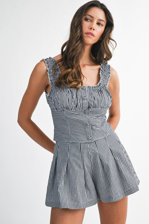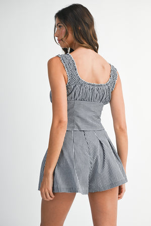 This playful black gingham set features a ruched bust sleeveless top with shoulder straps and button-down details, perfectly paired with matching pleated shorts. The shorts include a discreet back zipper and are fully lined for comfort. Ideal for sunny days and casual outings, this duo brings a fun, flirty vibe to your wardrobe.