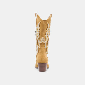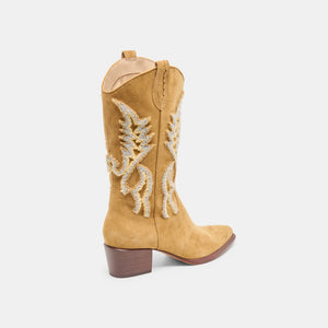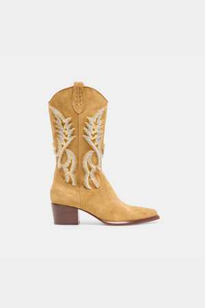 Knee-high VILA is a sustainably-crafted boot with all the quintessential western-inspired details. An intricate stitching design, a stacked block heel, and a pointed toe are complete with pull tabs that beg you to jump in the saddle—or at least look the part.