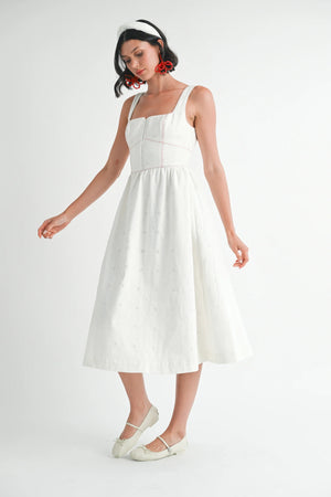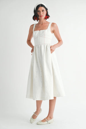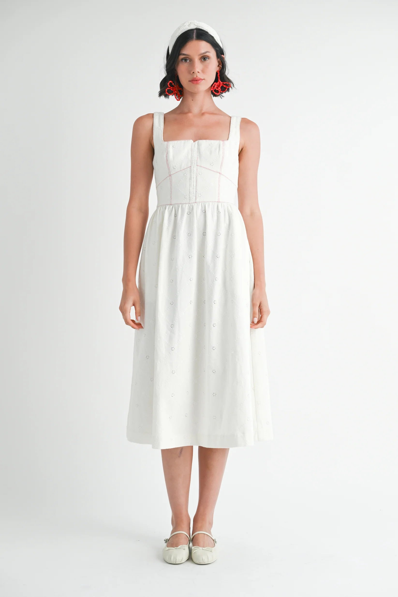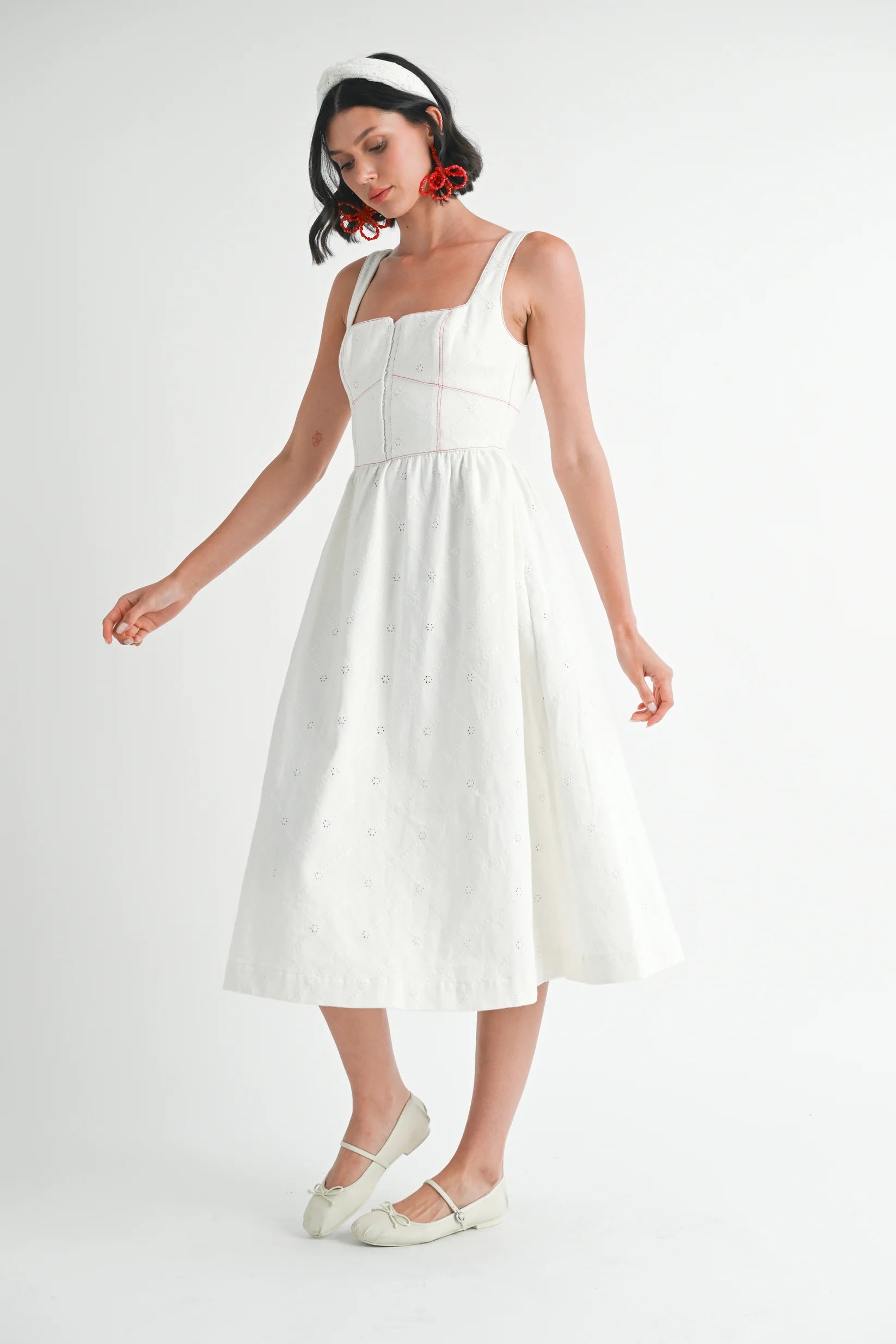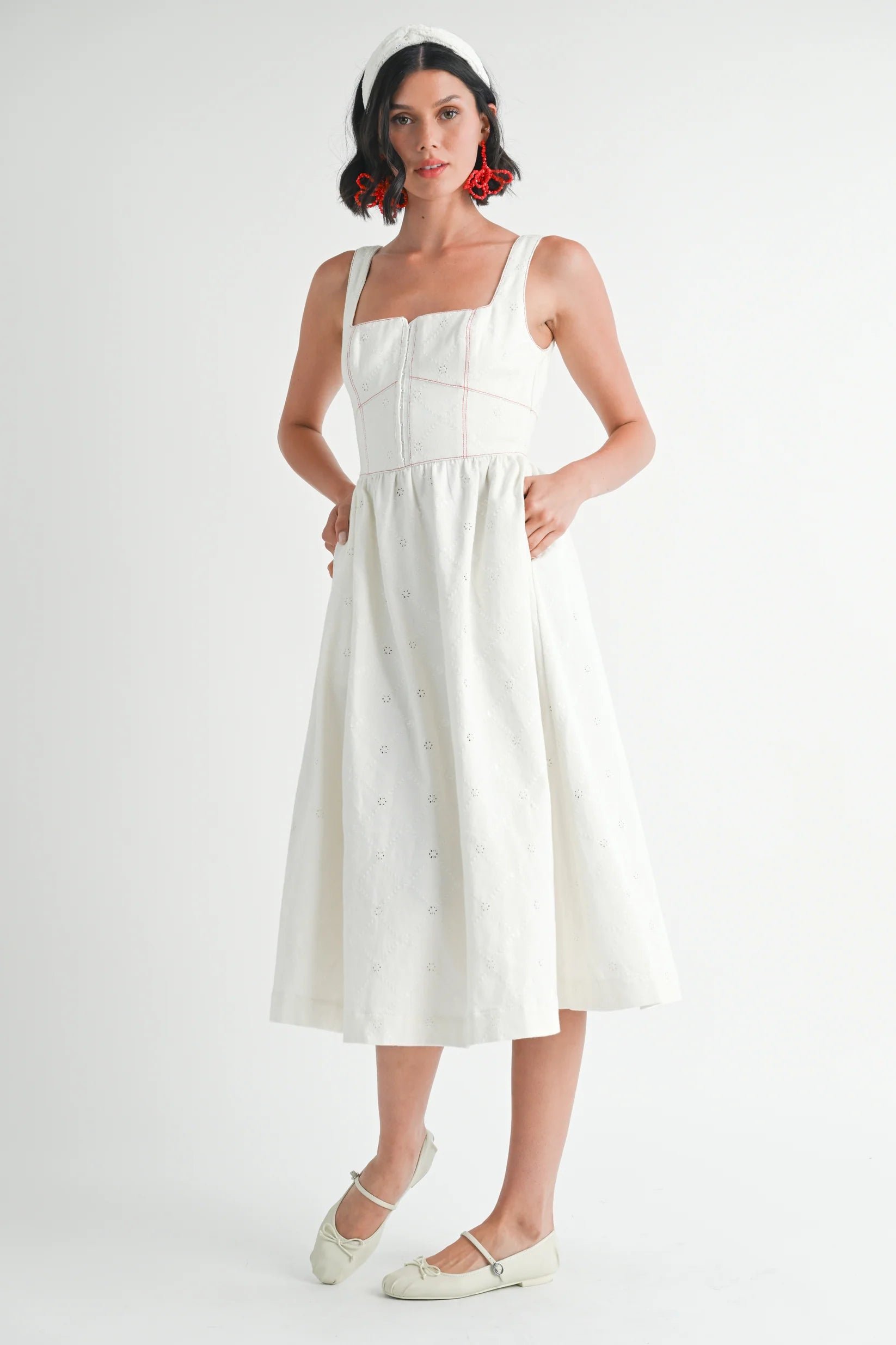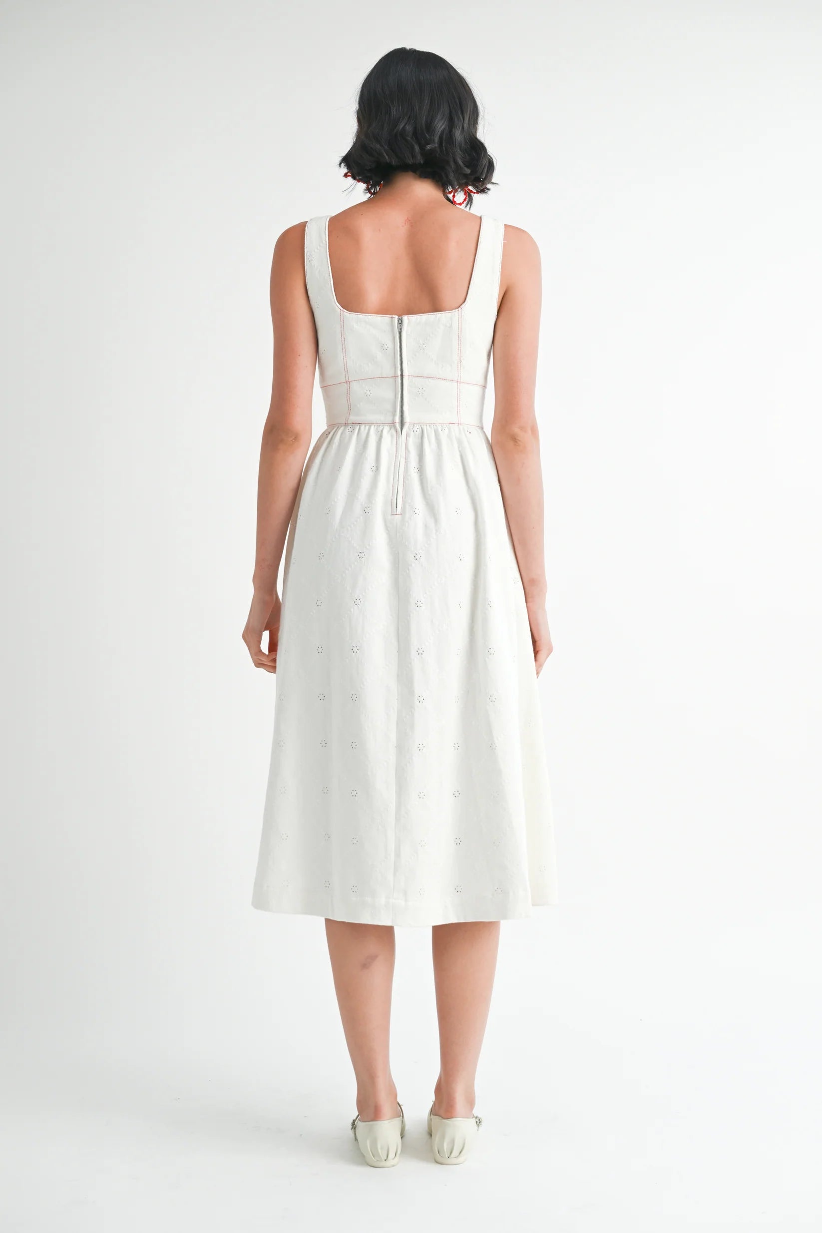 This playful midi dress features charming contrast stitching and delicate eyelet details that add a touch of whimsy to your denim look. Perfect for sunny days and casual outings, its flattering silhouette combines comfort with a fun, flirty vibe. Dress it up or down for effortless style that turns heads wherever you go.