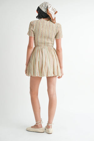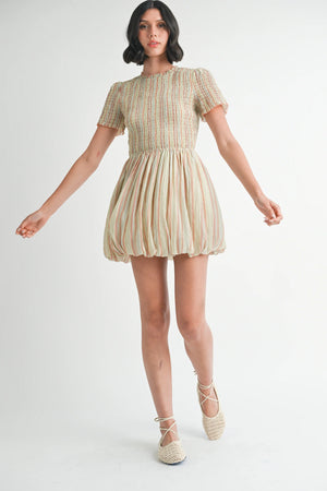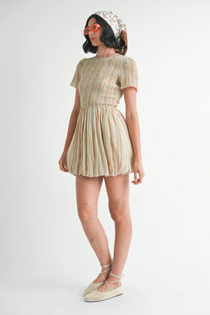 This playful mini dress features a smocked bodice and short puff sleeves for a fun, flirty look. Crafted from a soft blend of 70% lyocell and 30% nylon, it offers lightweight comfort and a flattering fit. The bubble silhouette adds a whimsical touch, while the polyester-spandex lining ensures stretch and ease of movement. Perfect for sunny days and casual outings, just hand wash to keep it looking fresh and fabulous.
