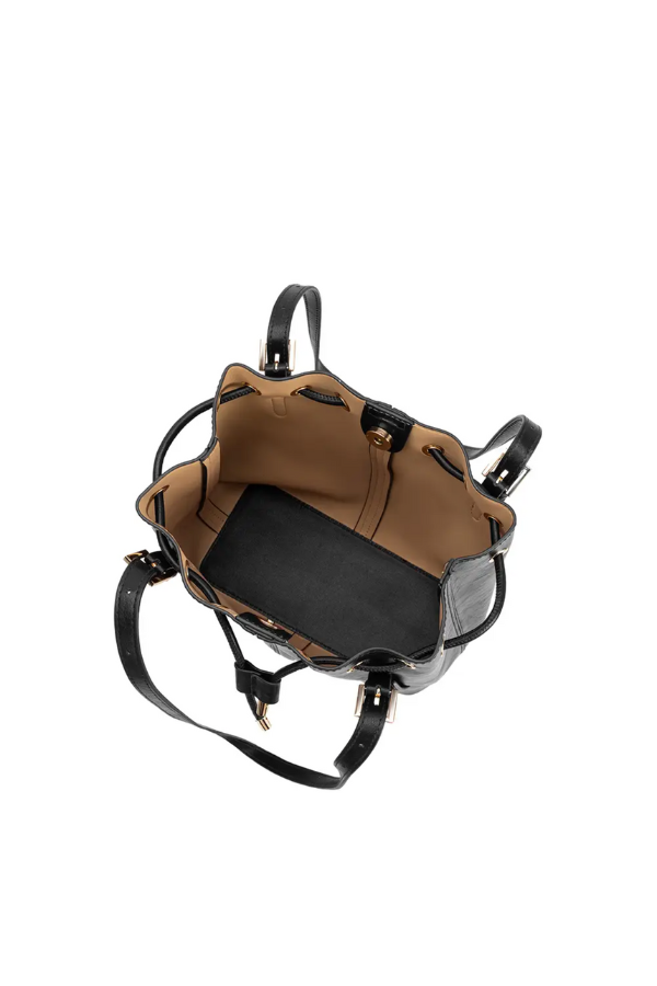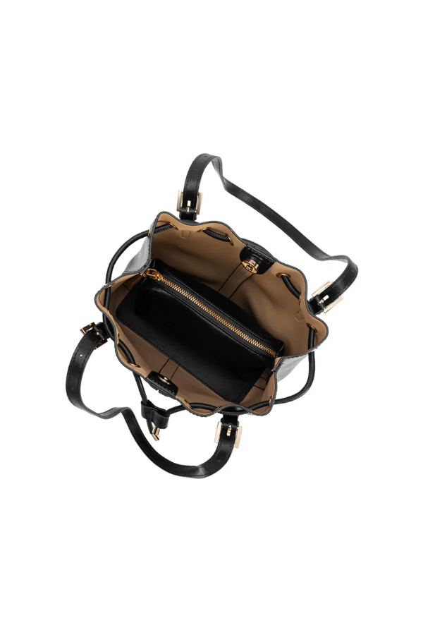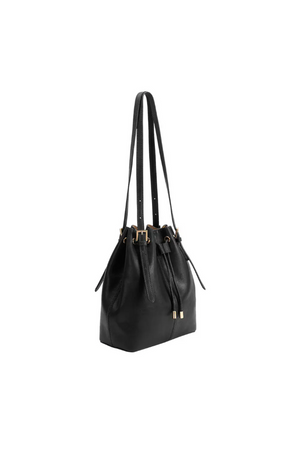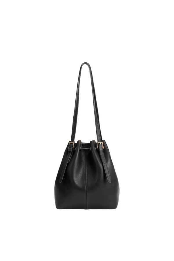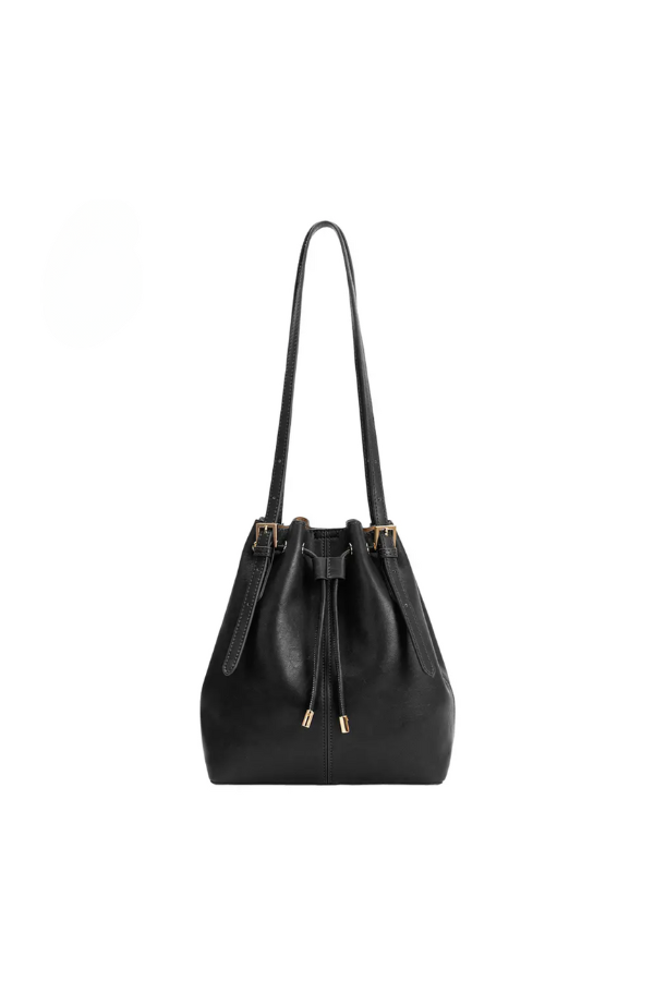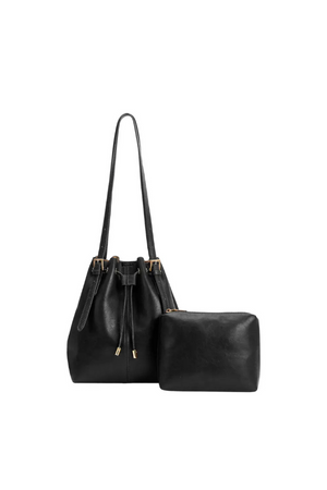 Sleek, structured, and sustainably made. The Sally shoulder bag features a roomy interior, adjustable straps, and a removable zip pouch to keep you organized. Finished with gold-tone details and a soft drawstring detail with a magnetic closure. *