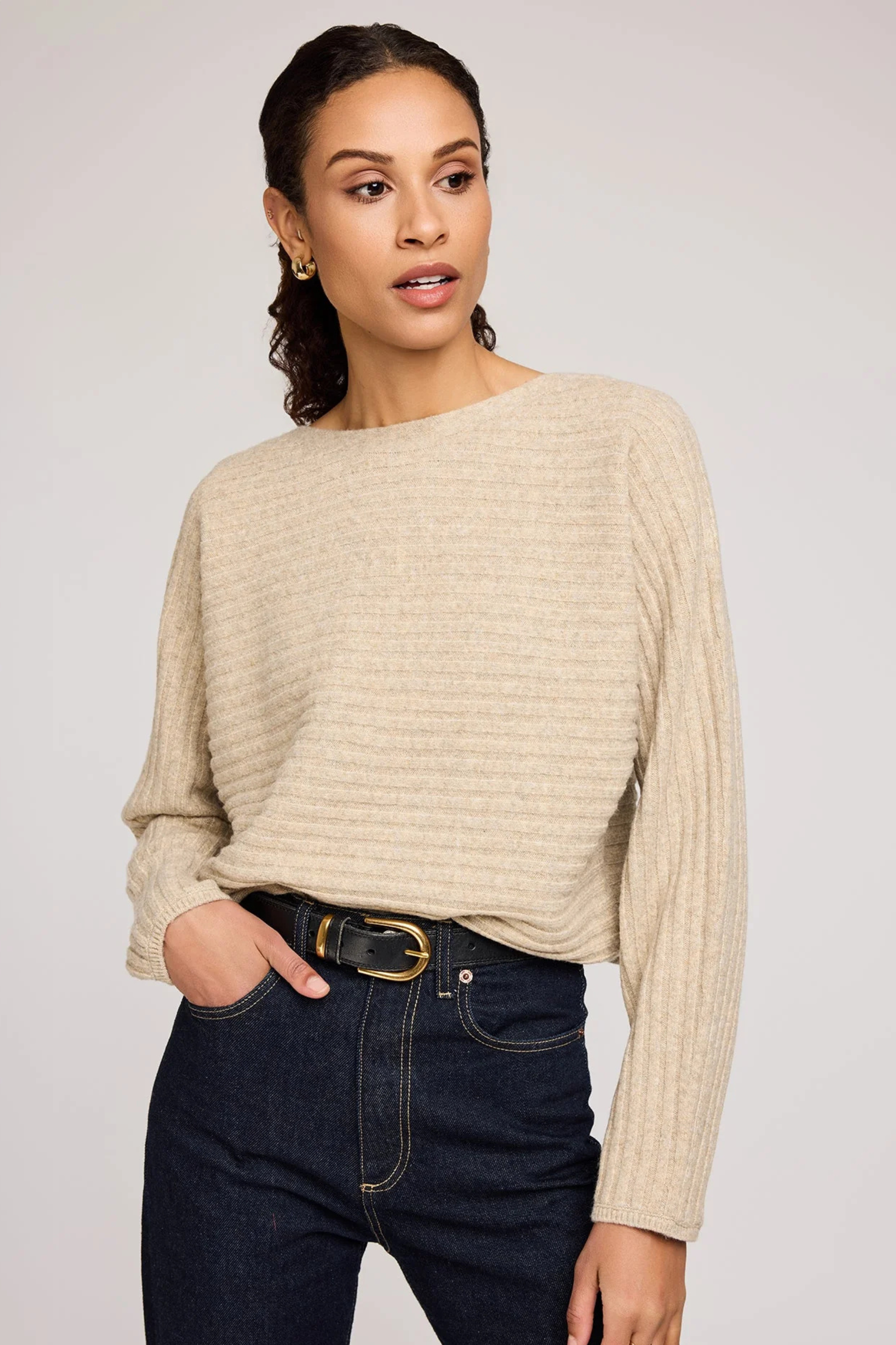The Niko sweater is made of a soft heathered yarn with a horizontal rib knit pattern. Features include a boat neckline and dolman sleeve for an effortless feel.