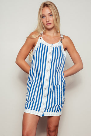 Embrace sunny days in our Sunshine Stripe Overall Dress! This playful denim number brings western vibes with bold vertical stripes and convenient button-front styling. Breathable cotton-denim blend keeps you cool, while front patch pockets add functionality. The adjustable buckle straps create a relaxed, boho-inspired silhouette that sits above the knee—perfect for layering or rocking solo as a breezy alternative to maxi dresses!